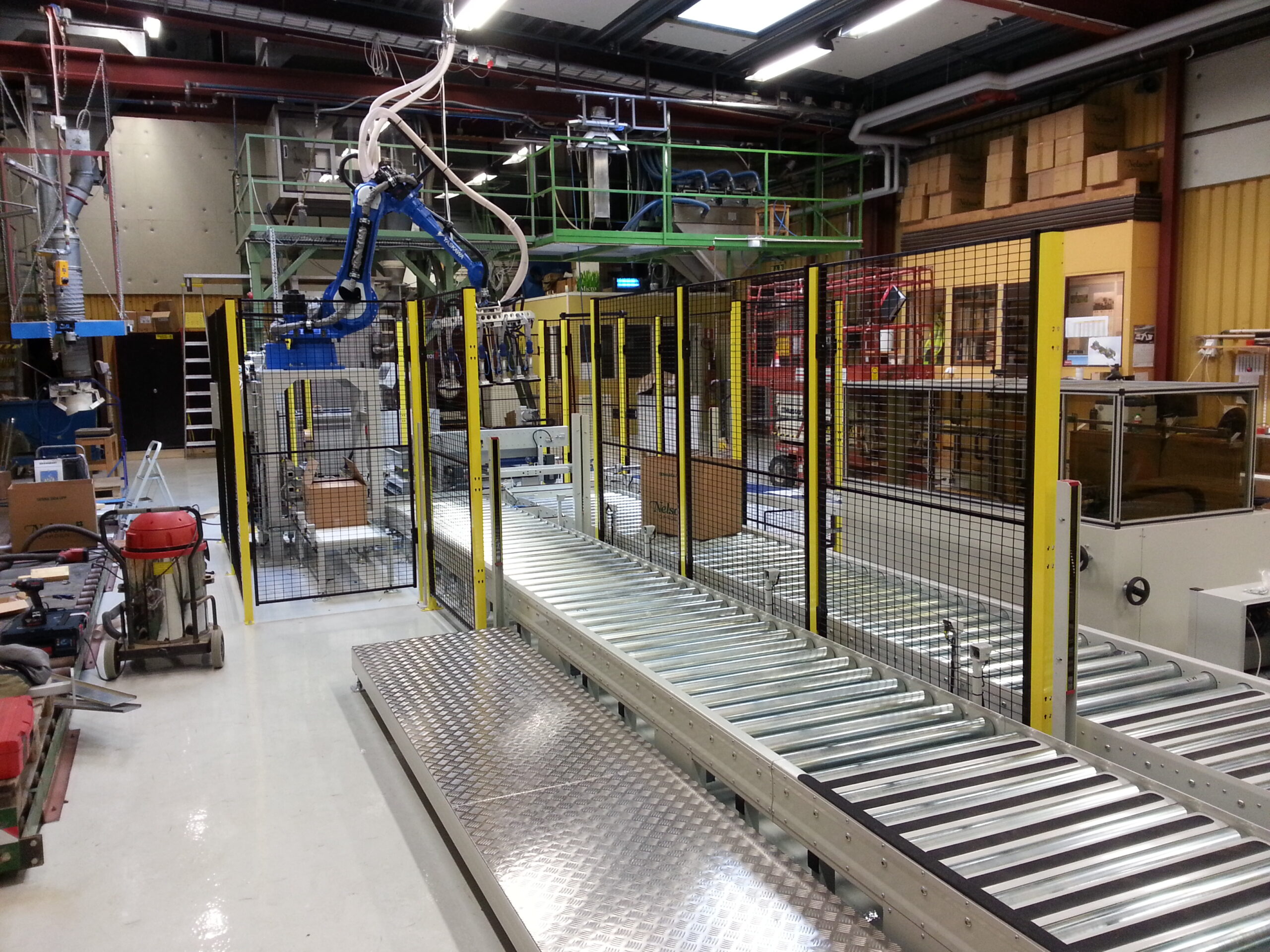 Helautomatisk förpackningslinje till olika storlekar av fröpåsar där vi med hjälp av robot kan paketera påsarna i lådor, halvpall eller helpall. Det tillhör även automatisk pallhantering, låduppresare och lådförslutare och utmatning av färdigpackat gods för vidare transport med truck.