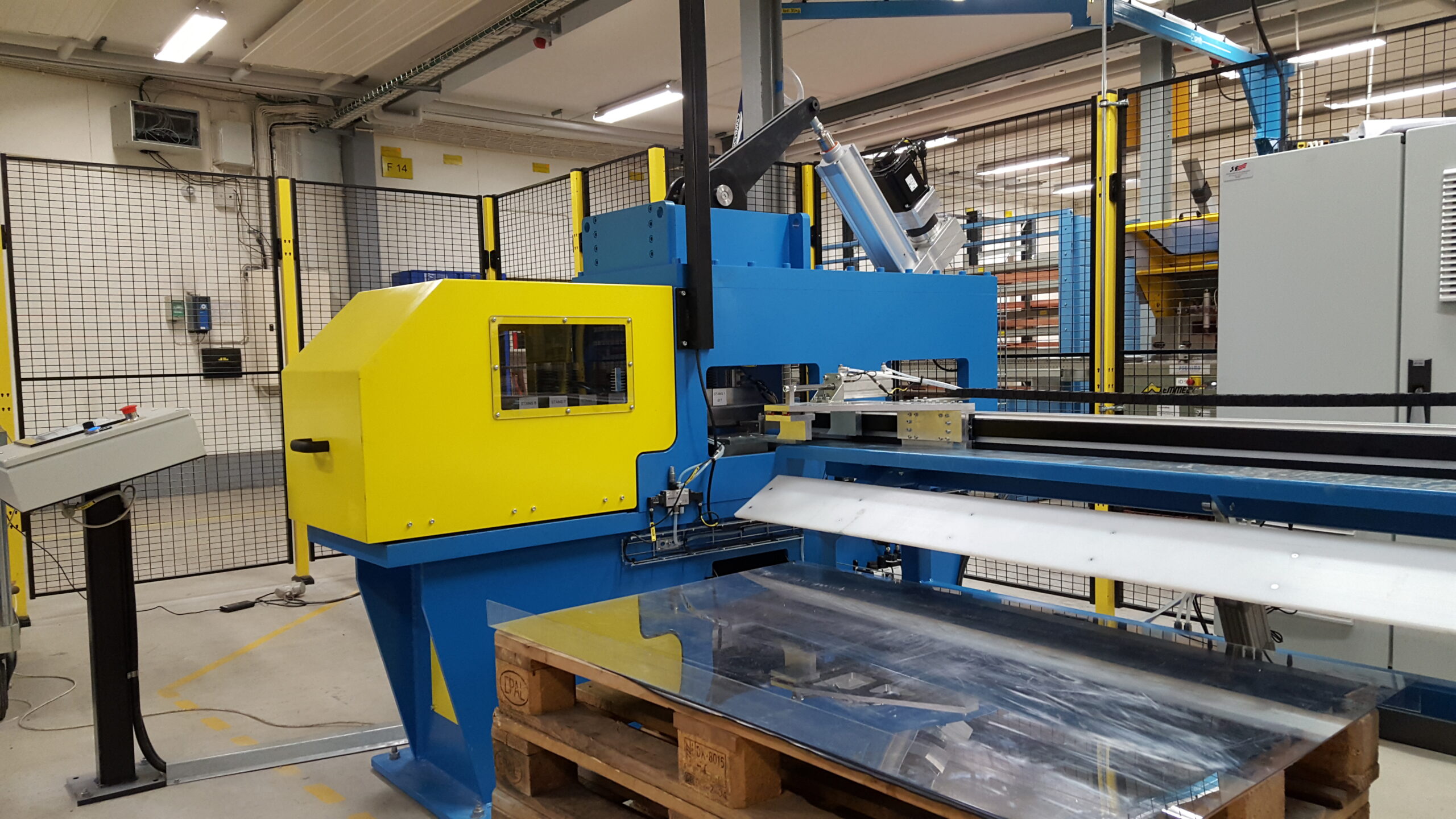 En komplett linje där man fyller på ett magasin med önskad kopparskena som sedan matar ut en skena i taget till inmatningsbanan, skenan transporteras vidare in i stansmaskinen där den fixeras och nollpunkten sätts. Gripklon går in och tar över transporten som drivs med servomotor för håltagning i X-led. Stansen är utrustad med ett verktygsmagasin för olika håldiametrar och även den drivs med servomotor för håltagning i Y-led.